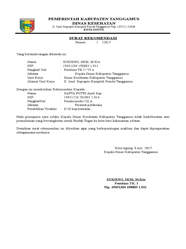 Surat rekomendasi dari kepala satuan kerja; surat rekomendasi pindah tugas. Pemerintah kabupaten bandung menerima surat rekomendasi pindah bekerja dari.